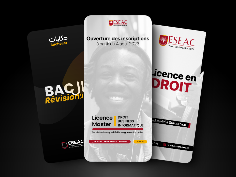 This is an advertisement for a private business school called ESEAC. They are offering programs in Business and Informatics, as well as a Law degree. The ad highlights that they offer a high quality of education and is exclusive to Sfax and Sud.