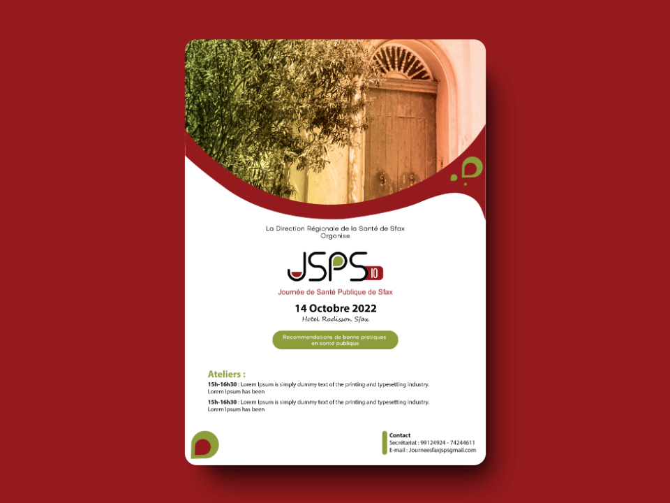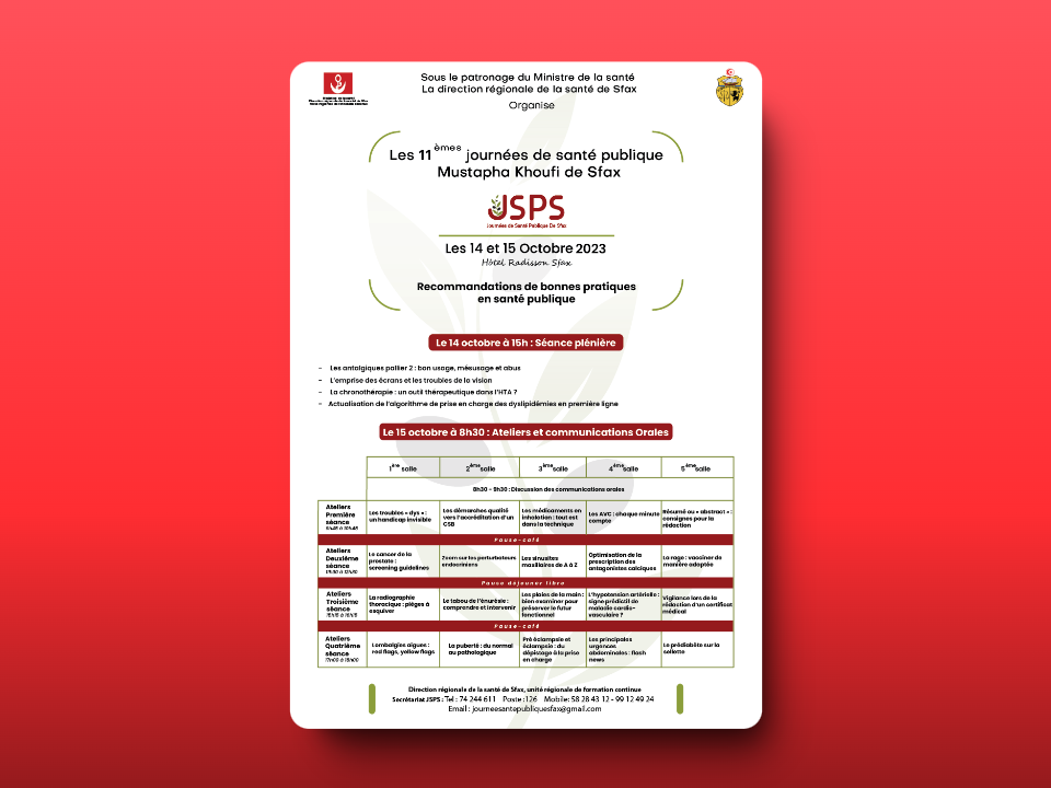 This is a flyer for a public health day in Sfax, Tunisia. The event is organized by the Regional Health Directorate of Sfax and will be held on October 14, 2022 at the Radisson Hotel. The flyer includes information about the event, including the date, time, location, and a list of workshops. It also includes contact information for the organizers. The flyer is designed in a simple and clean style, with a focus on the event information.