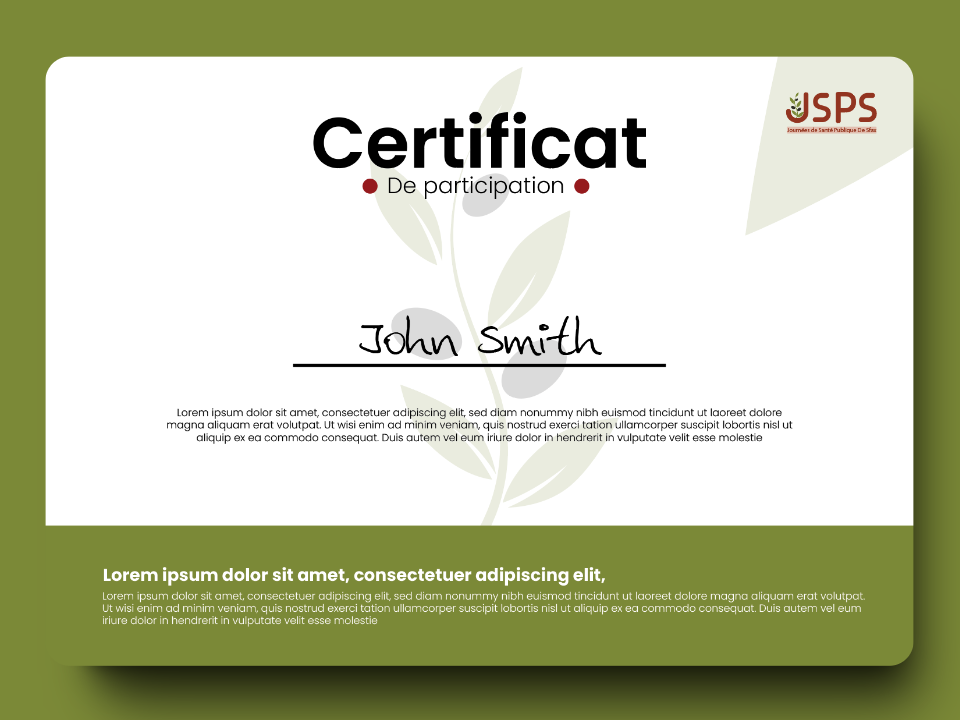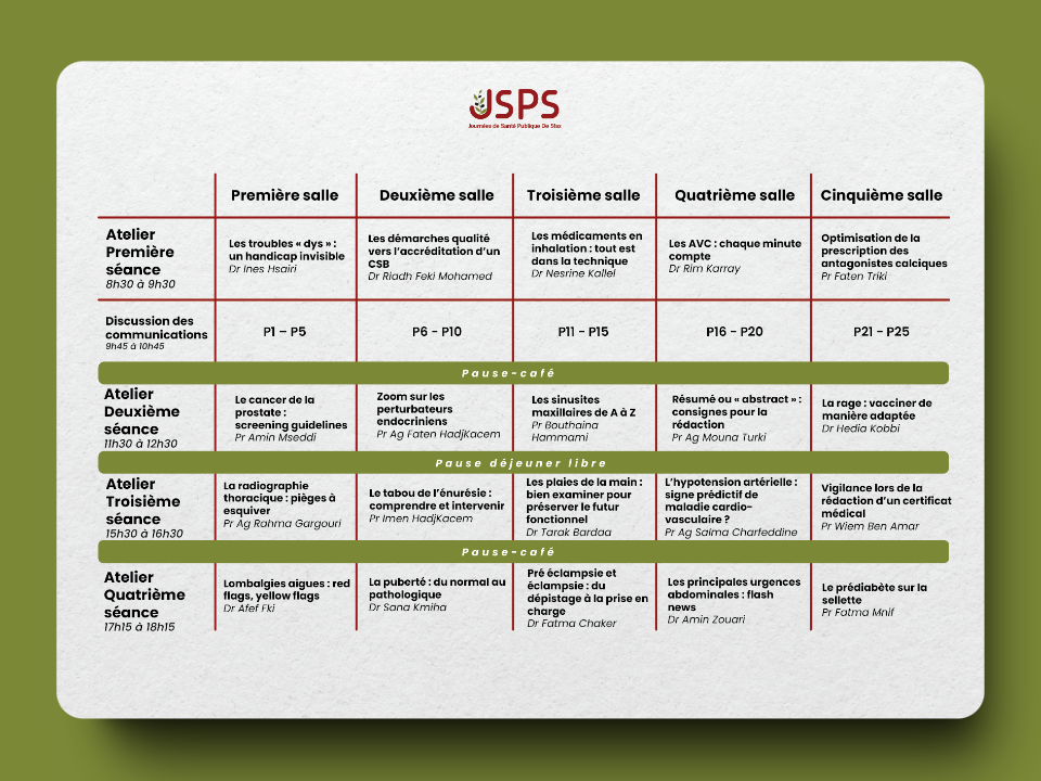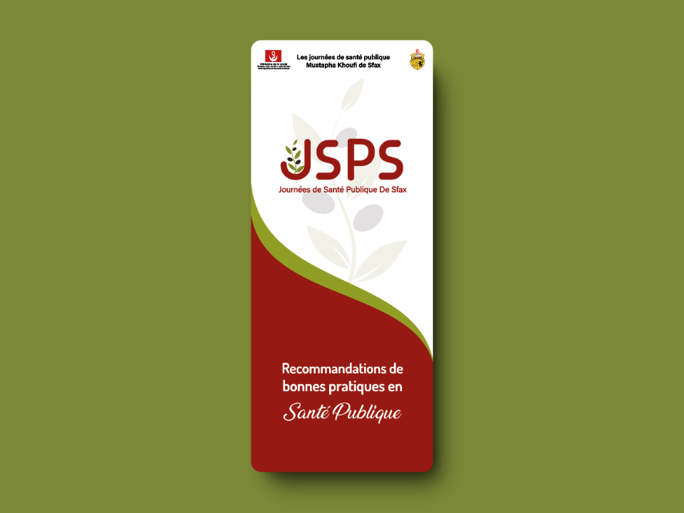 This is a poster for the Public Health Days of Sfax. The poster features a stylized olive branch and the acronym "JSPS." The text below the logo states that it is for "Recommandations de bonnes pratiques en Santé Publique" . It is likely that the poster is advertising a series of health-related events or workshops.