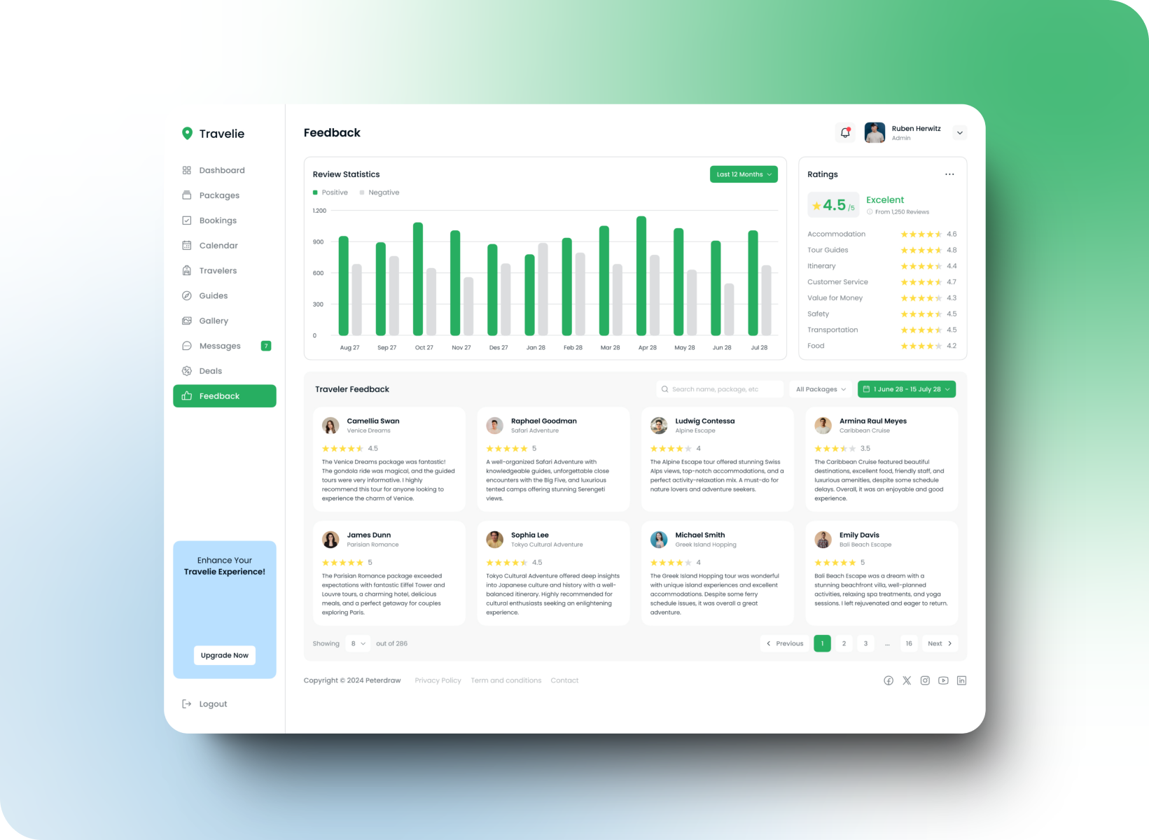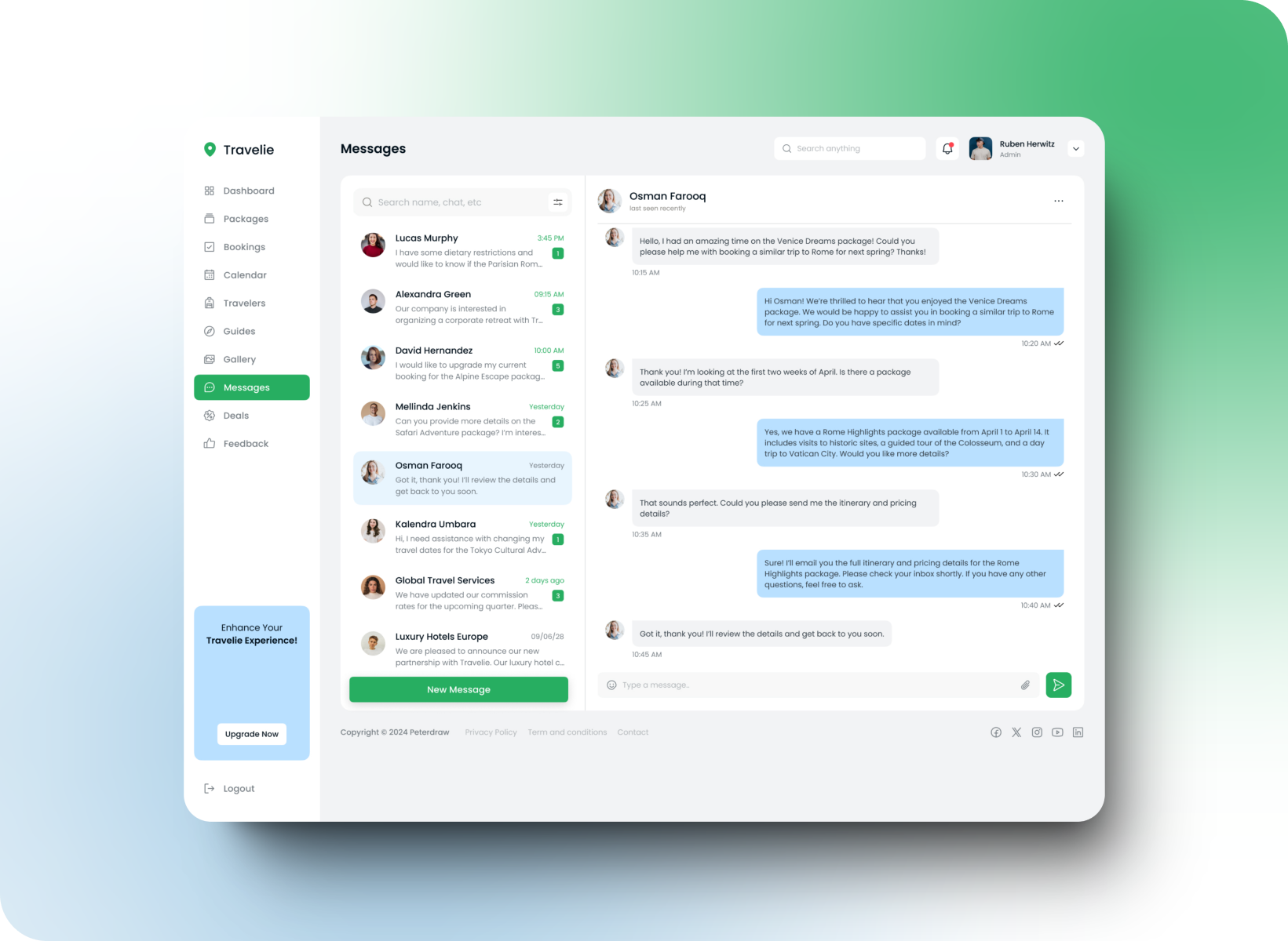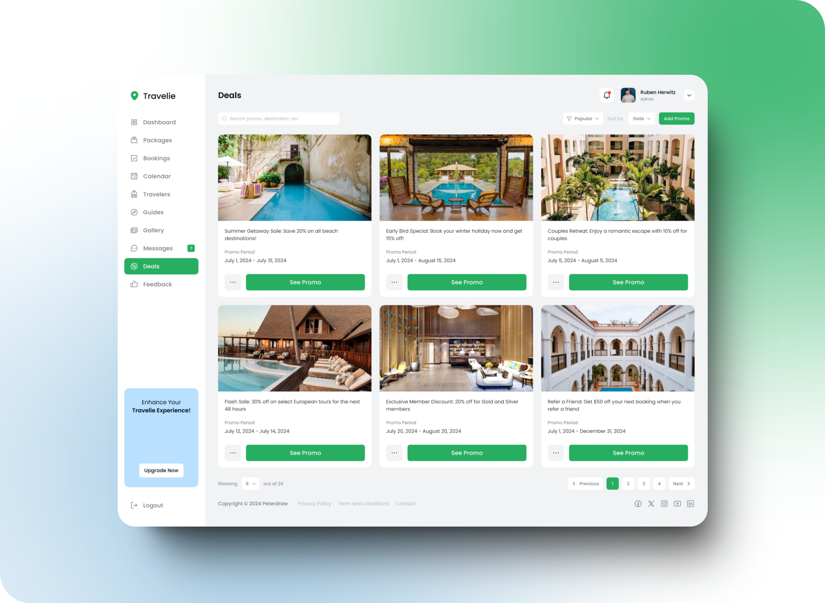 This Travelie "Packages" interface presents a complete list of available travel packages, with essential information such as name, destination, duration and price per person.